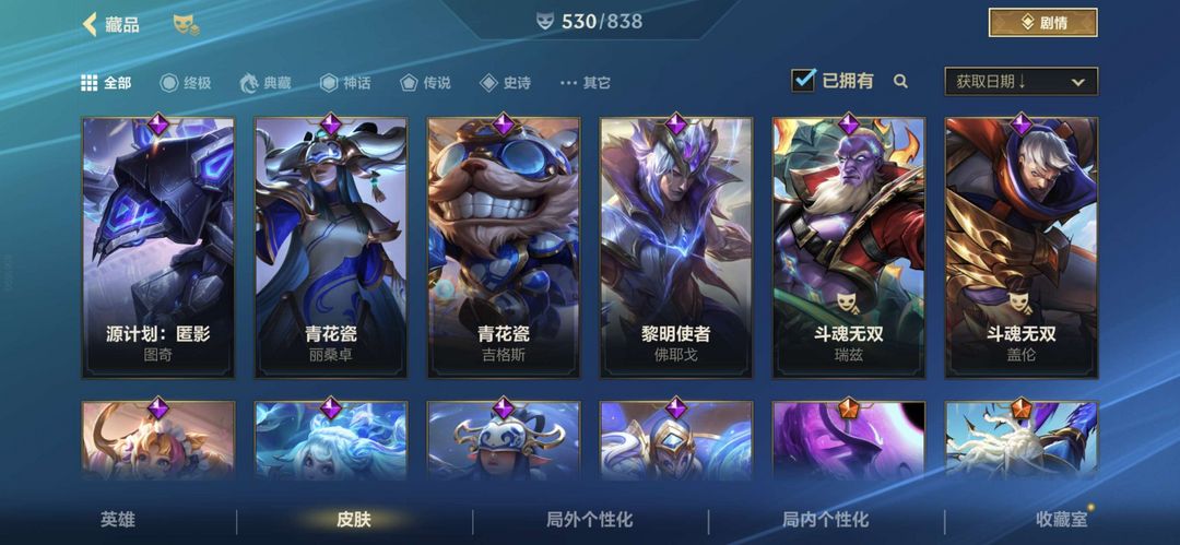 530皮肤-4神话 54传说 327史诗 全英雄 9w收藏分玩家