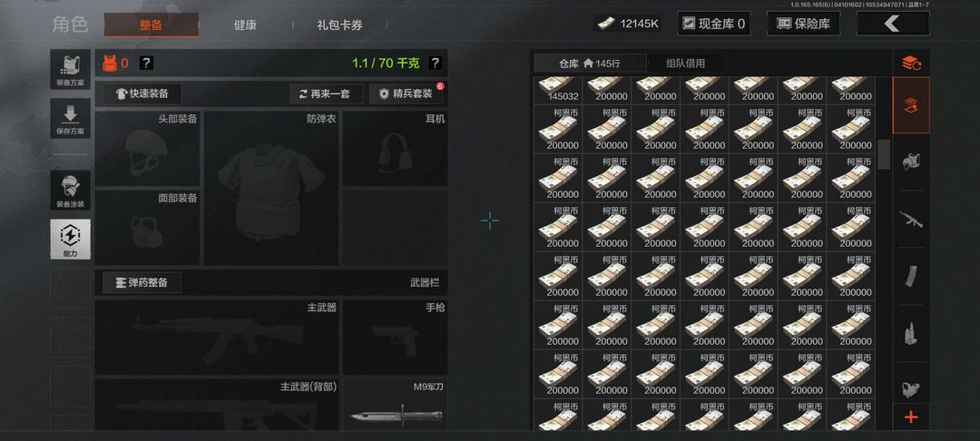 电台满六格钥匙链三个金枪皮,一个金燃烧瓶,一个金手雷,多个金战术道具,仓库一千二百万,纯币一千二百万