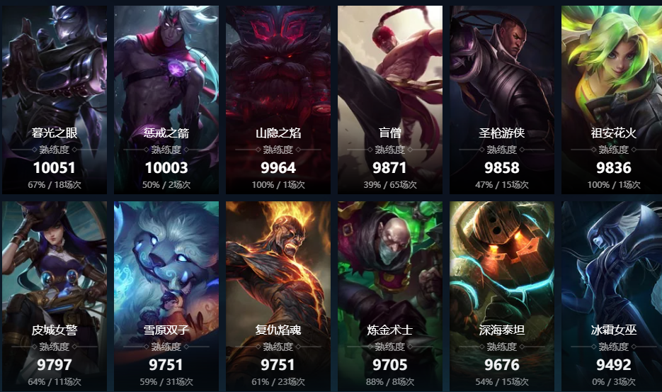 寒冰射手;圣枪游侠;暗夜猎手;皮城女警;麦林炮手;赏金猎人;黑暗之女;德邦总管;远古恐惧;无极剑圣;