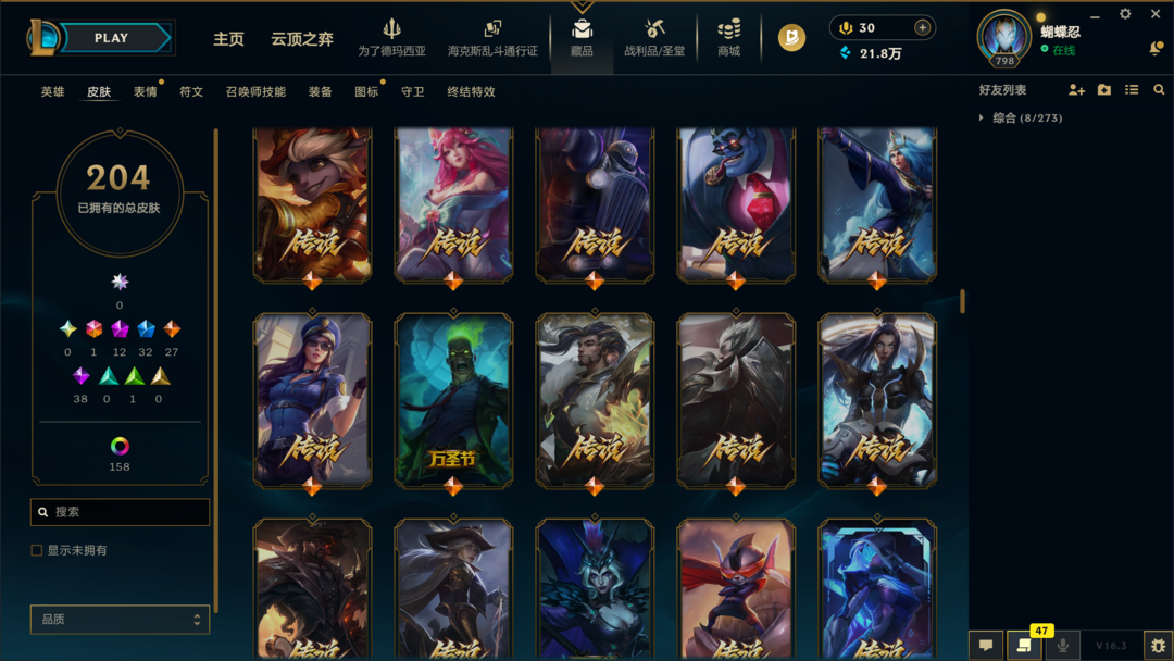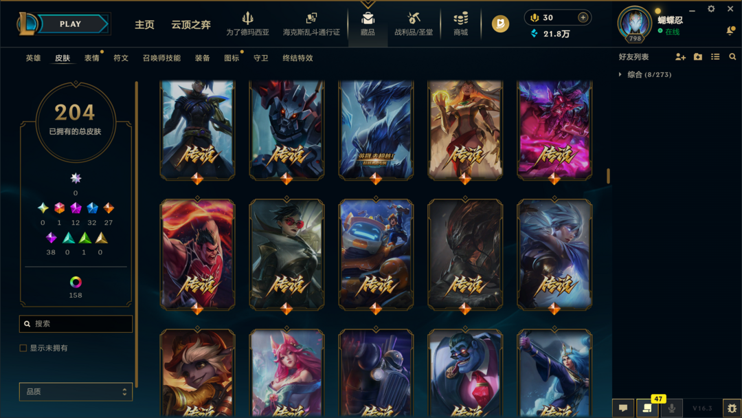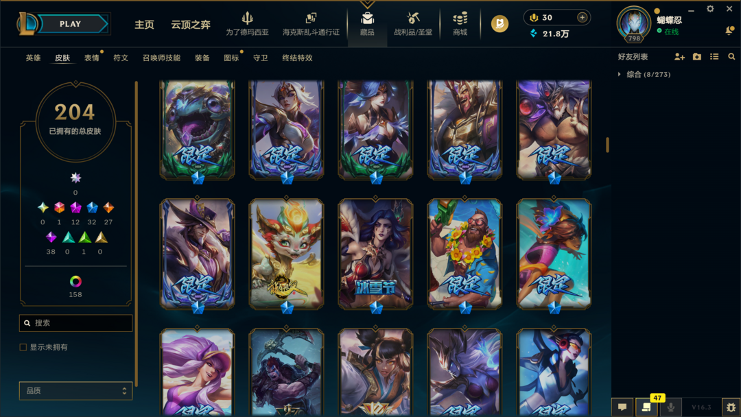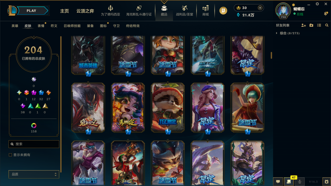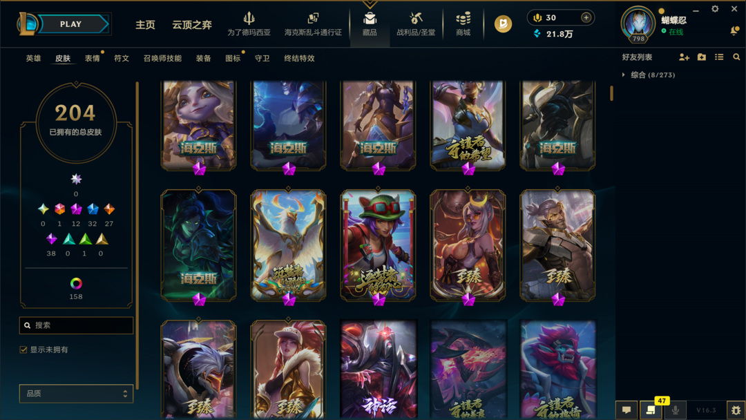可排位300皮肤〓20至臻海克斯〓神王摄魂武装〓黑夜亚索〓冰雪节限定