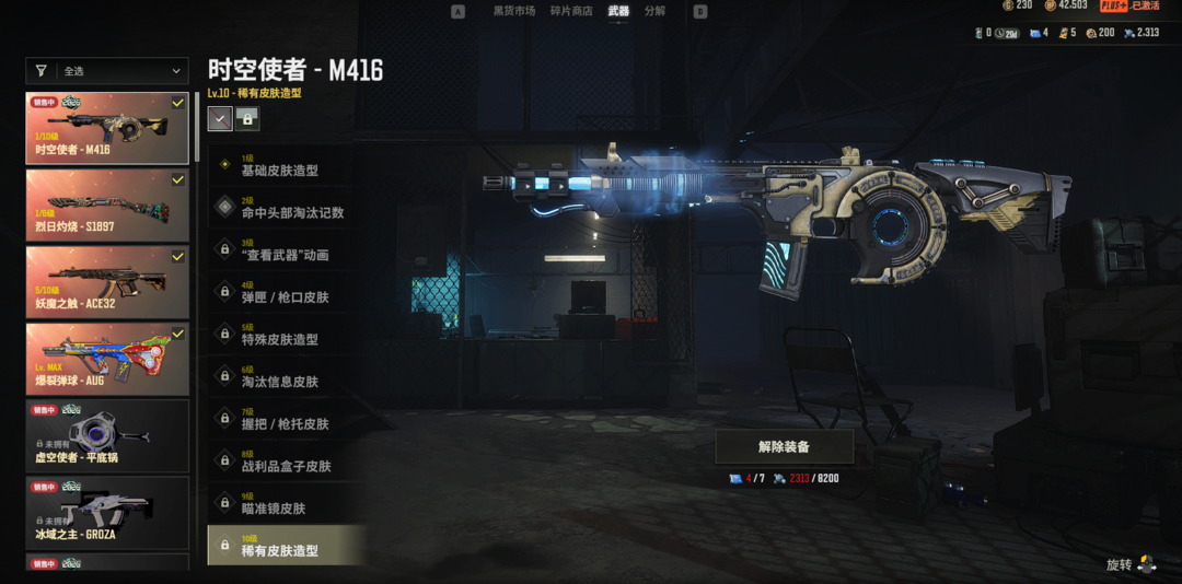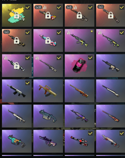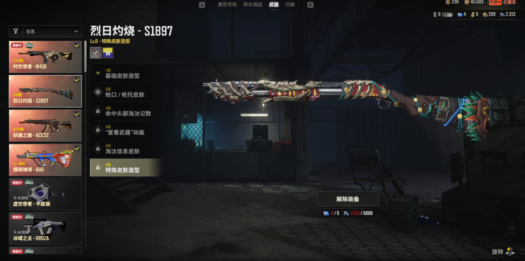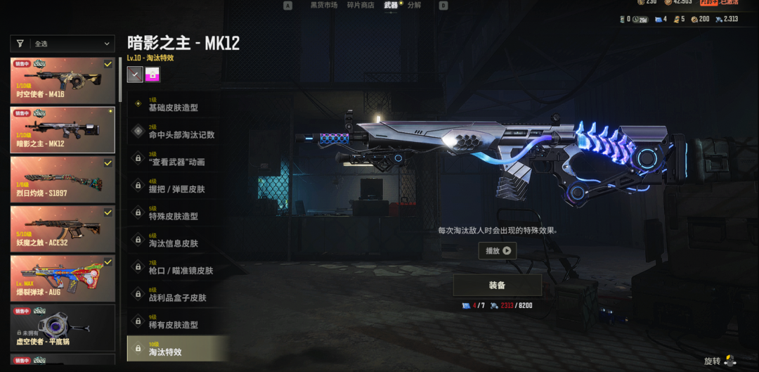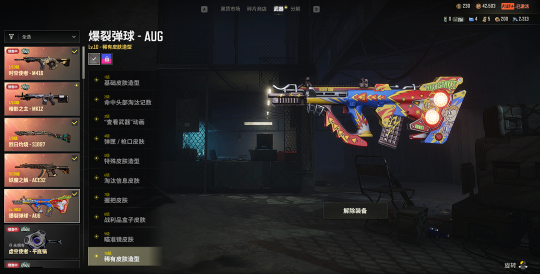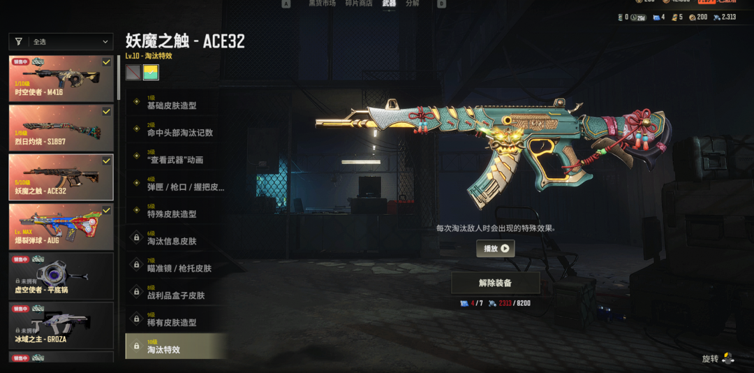 蝴蝶阿斯顿马丁⭐10级爆裂AUG⭐5级妖魔异色ACE⭐1级时空M4⭐1级暗影MK12⭐紫烟